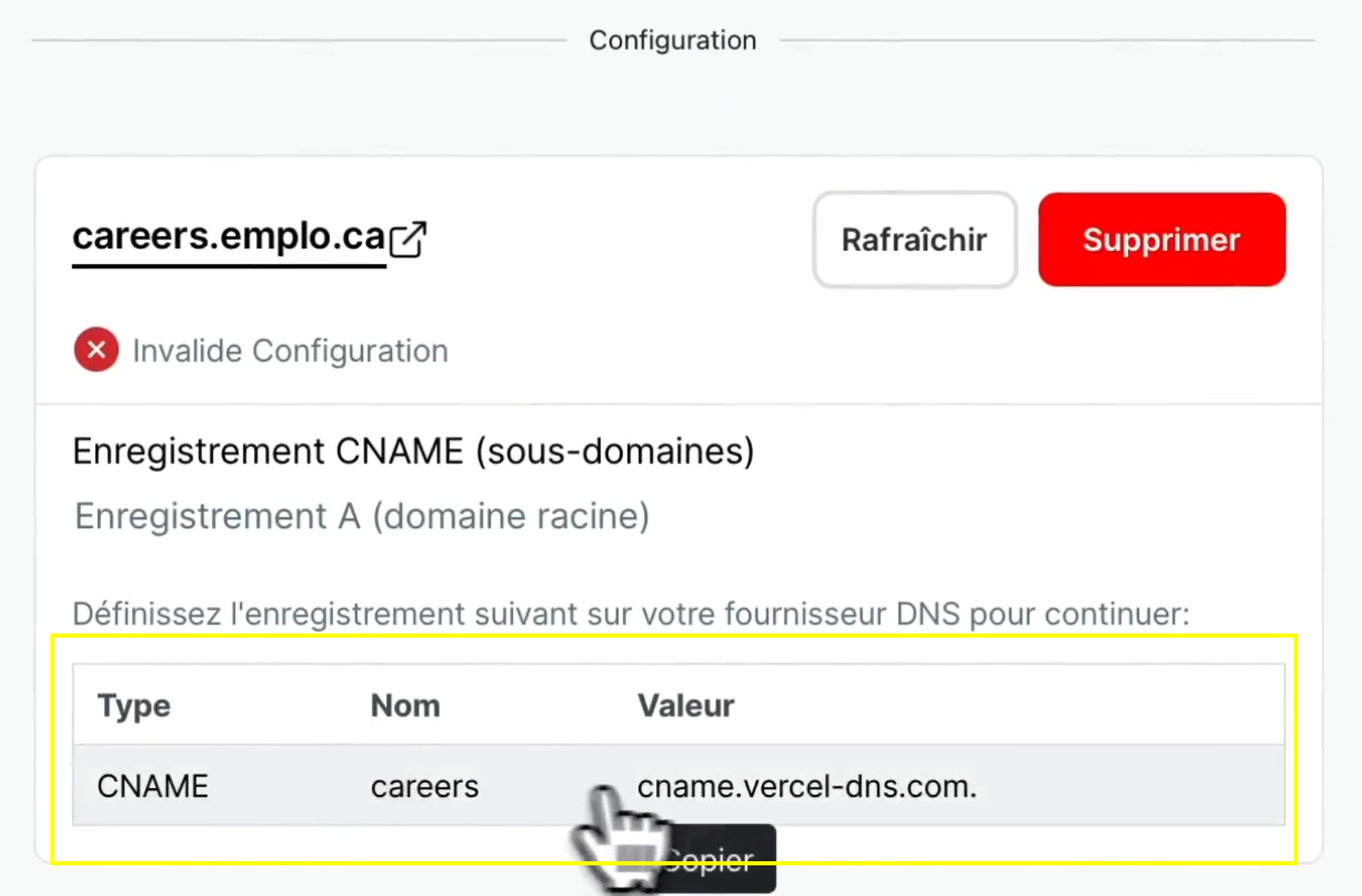 Pour ajouter un sous-domaine, vous devez ajouter un enregistrement dans votre DNS. Emplo vous donne l'enregistrement à ajouter. Voici les étapes à suivre :